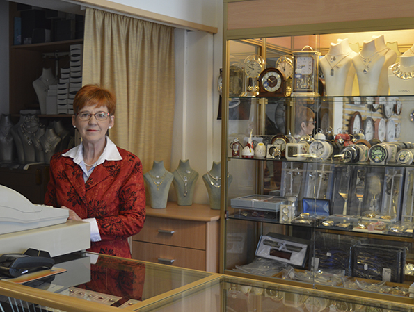Liikkeen omistaja Eila Makkonen valloittaa tyylikkyydellään. Hän neuvoo ja opastaa yli 50 vuoden kokemuksella sopivan korun tai kellon valinnassa.